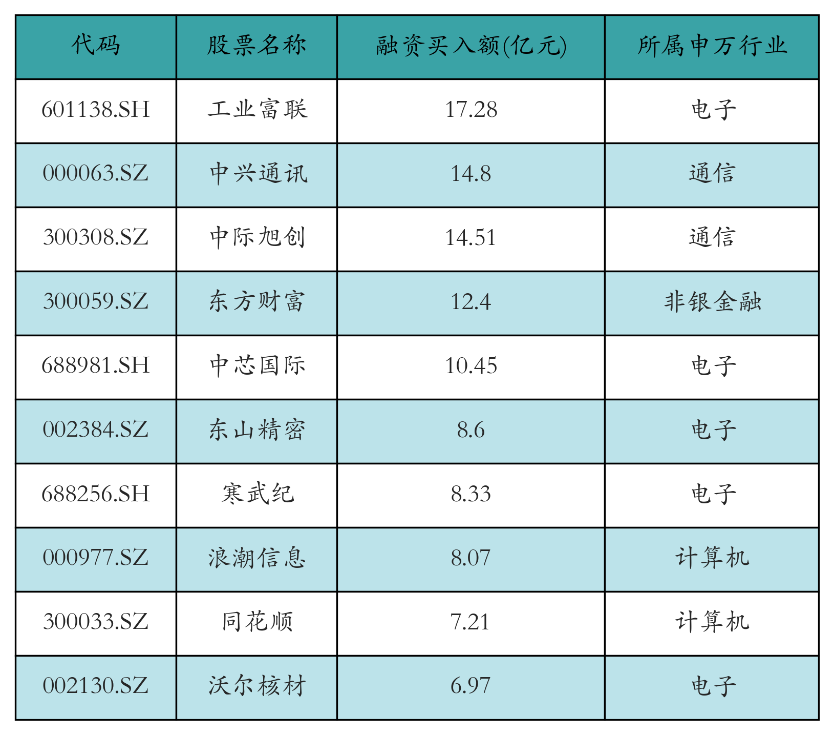 两市共有3402只个股有融资资金买入,其中工业富联、中兴通讯、中际旭创排名前三,买入金额分别为17.28亿元、14.8亿元、14.51亿元。融资买入额前10个股详情见下表: